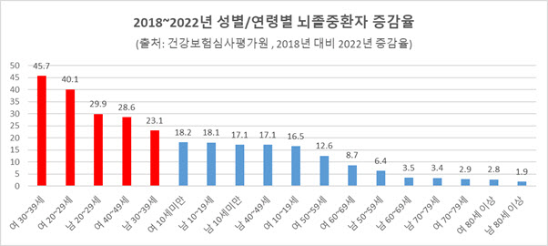 30대 여성의 경우 2018년에는 7,152명이었으나 2022년에는 9,363명으로 45.7% 증가했고 이어 20대 여성은 2018년에는 2,663명이었으나 2022년에는 3,526명으로 40.1% 늘어났으며, 20대 남성 29.9%, 40대 여성 28.6%, 30대 남성 23.1% 순으로 20~30대 뇌혈관질환 환자가 증가한 것으로 파악되었다.