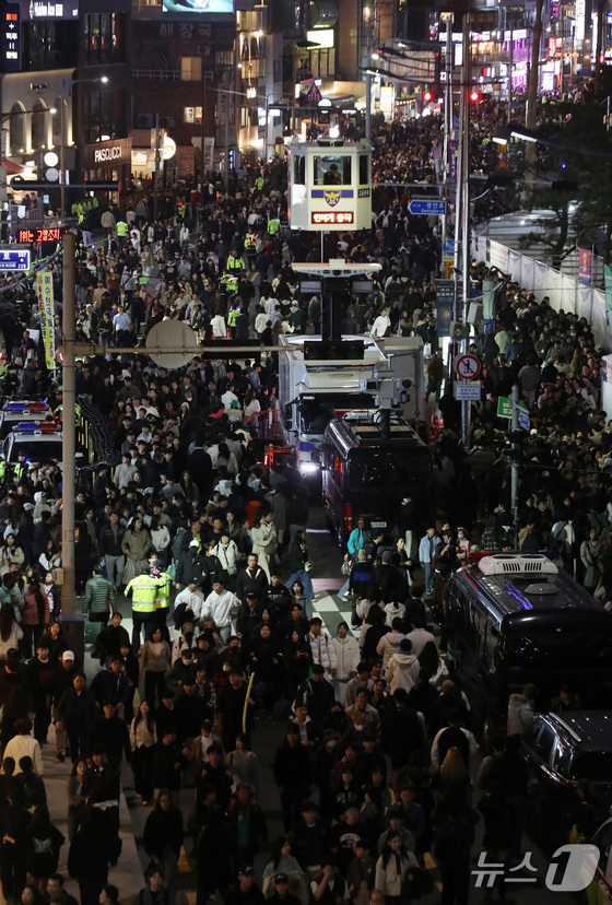 15일 오후 부산 수영구 광안리해수욕장 일대가 '제20회 부산불꽃축제'를 관람하기 위한 관람객들로 북적이고 있는 가운데 경찰이 고공관측을 하고 있다. 2025.11.15/뉴스1 © News1 윤일지 기자