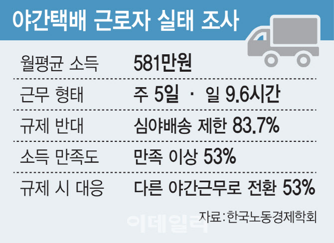 연구책임자인 박영범 한성대 명예교수는 “야간·새벽 배송은 근로자가 스스로 선택한 근무 형태이자 생계 유지에 필수적인 고수익 작업”이라고 설명했다.