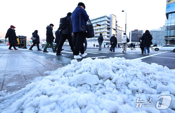 폭설 후 한파로 도로 곳곳이 얼어붙은 5일 오전 서울 광화문역 일대에서 시민들이 출근길 발걸음을 옮기고 있다. 2025.12.5/뉴스1 © News1 구윤성 기자