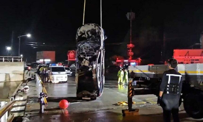 목포해경이 지난 6월 진도군 진도항에서 일가족 4명이 탑승했던 차량을 인양하는 모습. (사진=목포해경 제공)