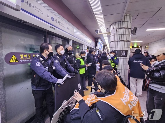 서울 중구 지하철 1호선 시청역 서울역 방면 승강장에서 시위 중인 전국장애인차별철폐연대와 서울교통공사가 대치 중이다. 2026.01.02/뉴스1 © News1 유채연 기자