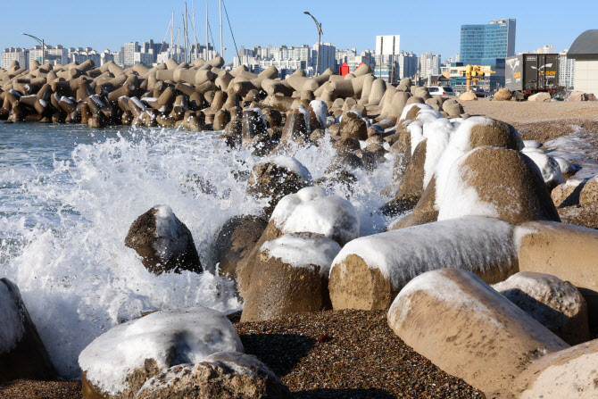 추위가 절정을 보인 22일 오전 경북 포항시 북구 두호동 바닷가 콘크리트 블록에 바닷물이 얼어붙어 있다. (사진=연합뉴스)