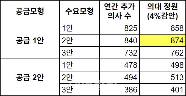 보건의료정책심의위원회(보정심)는 의료인력 수급추계위원회(추계위)가 산정한 의사 증원 필요량을 토대로 최종 증원 규모를 결정한다. 현재 보정심은 추계위가 제시한 총 12가지 안 가운데 6가지 안을 추린 상태다. 여기에 더해 2037년까지 졸업하는 공공의대 400명과 지역 신설 의대 200명을 반영하면 5년간 최대 4200명의 의사를 추가로 양성토록 계획 중이다. 이를 5년 안에 충원하려면 연간 840명 수준의 증원이 필요하다.