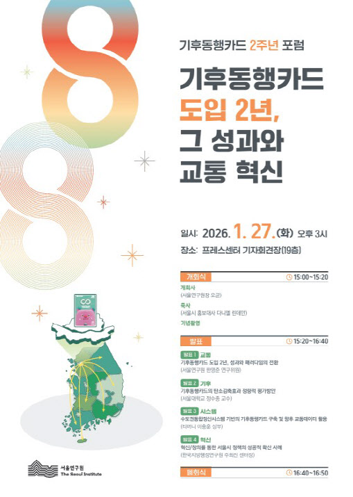 이번 포럼은 서울시 대표 기후·교통 정책인 기후동행카드의 성과를 교통·기후·시스템·행정 등 다양한 시각에서 분석하고, 대중교통·기후 정책의 새로운 패러다임 전환을 논의하기 위해 마련됐다. 포럼은 오균 서울연구원장의 개회사를 시작으로, 다니엘 린데만 서울시 홍보대사의 축사 및 사례 공유, 주제 발표, 폐회식 순으로 진행된다.