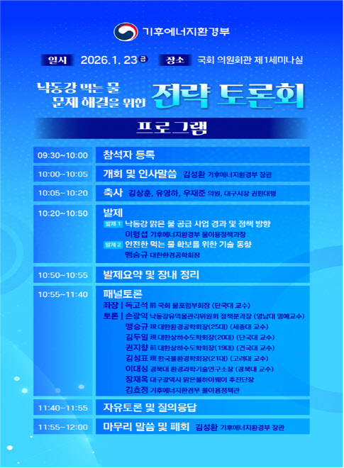 기후부는 이번 토론회를 시작으로 시민, 전문가, 국회, 지자체가 함께 참여하는 논의 구조를 본격화하고, 수렴된 의견을 2026년 타당성조사 용역과정에서 진행하는 파일럿테스트 시설 운영에 적극 반영할 계획이다. 아울러 대구시와 공동위원회를 구성해 지방정부와 중앙정부가 공동 책임 아래 대구시민에게 안전한 먹는 물을 공급하기 위한 전략 논의도 이어갈 예정이다.
