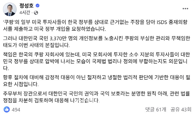 이어 “책임은 한국의 쿠팡 자회사에 있다”며 “미국 모회사에 투자한 소수 지분의 투자사들이 대한민국 정부를 상대로 압박에 나서는 모습이 국제법 법리나 정의에 부합하는지도 의문”이라고 지적했다.
