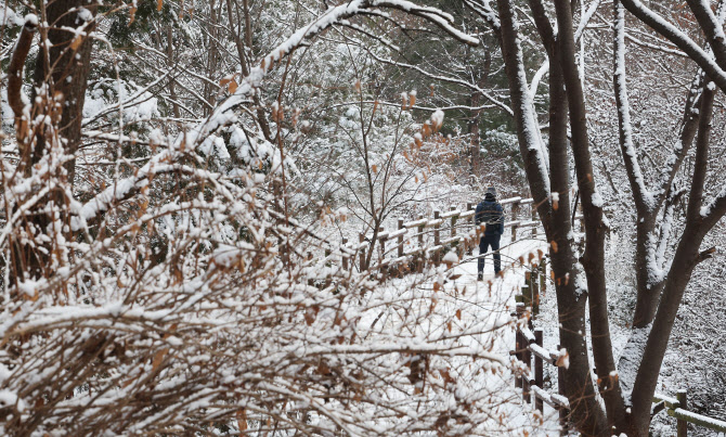 19일 경기도 수원시 영통구 한 공원에서 시민이 눈 쌓인 산책로를 걷고 있다. (사진= 연합뉴스)
