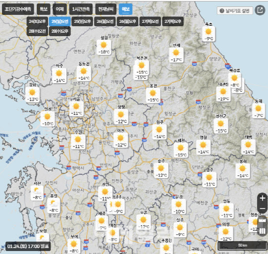기상청은 기온에 습도와 바람이 더해진 ‘체감온도’는 이보다 훨씬 낮을 것으로 내다봤다. 습도가 10%p 증가할 때마다 체감온도가 1도 가량 변하는 특성을 고려할 때, 실제 피부에 닿는 추위는 예보된 기온보다 더욱 가혹할 것으로 예상된다.