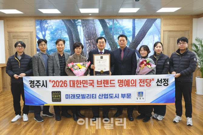 경주시가 ‘2026 대한민국 브랜드 명예의 전당‘ 미래모빌리티 산업도시 부문에 선정돼 주낙영 경주시장과 관계자들이 기념촬영을 하고 있다.(사진=경주시)
