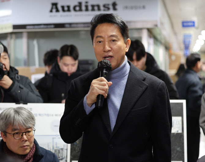 오세훈 서울시장이 지난 22일 서울 용산구 선인상가에서 소유자ㆍ상인들과 간담회를 갖고 인사말을 하고 있다. (사진=연합뉴스)
