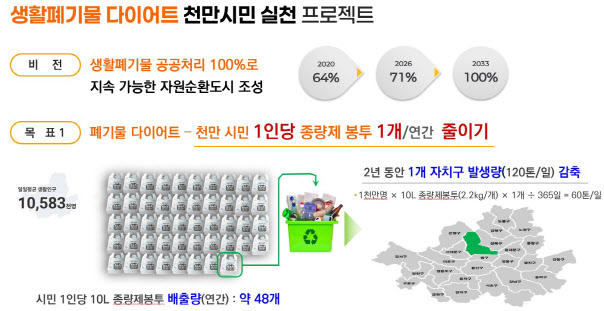 서울시는 26일 생활폐기물 다이어트를 이달부터 추진한다고 밝혔다. 이는 2020년 64% 수준인 생활폐기물 공공처리 비율을 2033년까지 100%로 늘리기 위한 것으로 1000만 시민 1명당 연간 종량제 봉투를 1개씩 줄이는 프로젝트이다. 현재 서울 시민 1인당 연간 배출하는 종량제봉투(10ℓ 기준)는 약 48개다. 인구 1000만명을 기준으로 보면 하루 60t의 쓰레기 감량 효과가 있다. 이는 2년간 자치구 1개에서 매일 나오는 생활폐기물 발생량(120t)의 절반 수준이다.