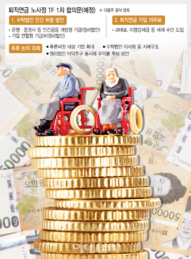 27일 이데일리 취재를 종합하면, ‘퇴직연금 노사정 TF’는 퇴직연금기금을 운용할 수탁법인에 은행·증권사 등 민간회사만 참여시키기로 합의를 마쳤다. 지난해 상반기 고용노동부 주도 전문가 포럼에서 기금형 퇴직연금 도입 방식을 논의한 데 이어, 하반기 양대 노총과 한국경영자총협회·중소기업중앙회가 참여하는 TF에서 가장 큰 쟁점인 수탁법인 형태를 두고 노사가 뜻을 모았다. TF는 최종 합의 단계를 거친 후 다음 주 공식 발표에 나설 방침이다.
