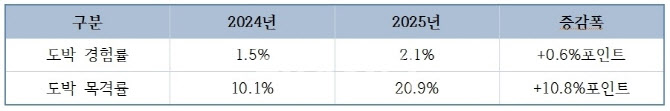 조사 결과에 따르면 ‘도박을 경험한 적 있다’는 응답은 2.1%로 2024년 진행된 조사결과(1.5%) 대비 0.6%포인트 상승했다. 주변에서 도박을 목격했다는 응답은 20.9%에 달해 같은 기간(10.1%) 두 배 이상 늘었다. 도박의 확산세가 커질 수 있다는 뜻이다.