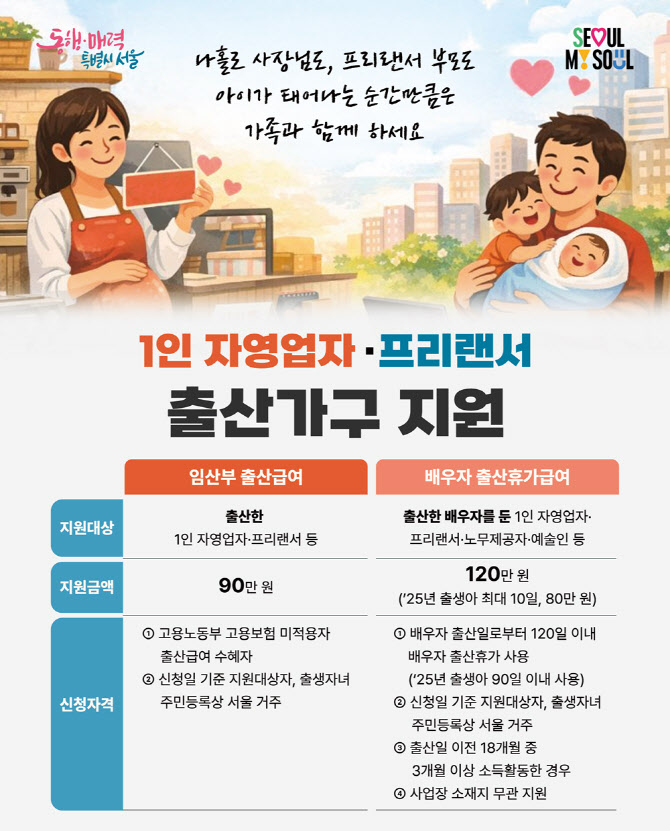 ‘1인 자영업자 등 배우자 출산휴가급여’는 임산부 배우자를 둔 1인 자영업자·프리랜서가 자녀 출생 후 120일(2026년 출생아부터) 이내 사용한 출산휴가 일수에 대해 일 8만원씩 지원한다.
