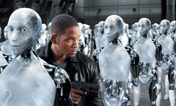 2004년에 개봉한 미국 SF 영화 ‘아이 로봇(I, Robot)’의 한 장면. 이 영화에서 형사로 출연한 윌 스미스가 휴머노이드 로봇이 대량 생산된 공장에서 문제를 일으킨 써니를 찾고 있는 장면으로 윌 스미스 바로 앞 로봇이 써니다.(사진=영화 캡쳐)