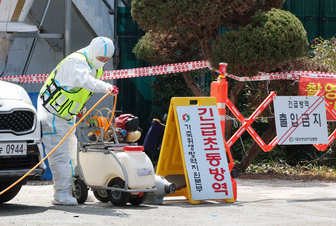 작년 4월 15일 전남 무안군 구제역 발생농장에서 방역본부 관계자가 소독 작업하고 있다. (사진=연합뉴스)