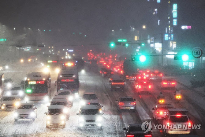 대설주의보가 발효된 지난해 12월 4일 경기도 수원시 팔달구 수원역 앞 덕영대로에서 차량이 서행하고 있다.(사진=연합뉴스)
