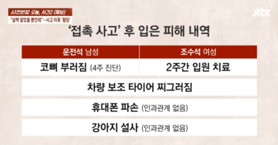 이에 그치지 않고 B 씨는 보조 타이어와 휴대전화 파손은 물론, 뒷좌석에 타고 있던 반려견이 설사 증세를 보인다며 추가적인 보상을 요구했다. A 씨는 "CCTV를 확인해 보니 사고 직후 두 사람은 이상 없이 걸어갔고, B 씨는 멀쩡한 휴대전화를 들고 있었다"고 억울함을 호소했다.
