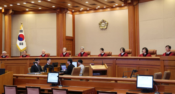 지난달 29일 서울 종로구 헌법재판소 심판정에 김상환 헌법재판소장을 비롯한 헌법재판관들이 착석해있다.(사진=연합뉴스)