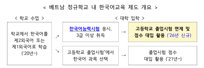 베트남 대입 제도는 우리나라의 대학수학능력시험(수능)에 해당하는 전국 단위 시험인 ‘고등학교 졸업시험’을 중심으로 운영된다. 베트남 학생들은 졸업시험에서 총 4개 과목에 응시하는데 이 중 국어(베트남어)와 수학은 필수 과목이다. 나머지 두 과목은 △외국어 △역사 △물리 △화학 △생물 △지리 △경제·법 △정보 △기술 중 선택해 응시한다. 외국어에 응시한다면 △한국어 △영어 △러시아어 △프랑스어 △중국어 △독일어 △일본어 중에서 하나를 고르면 된다.