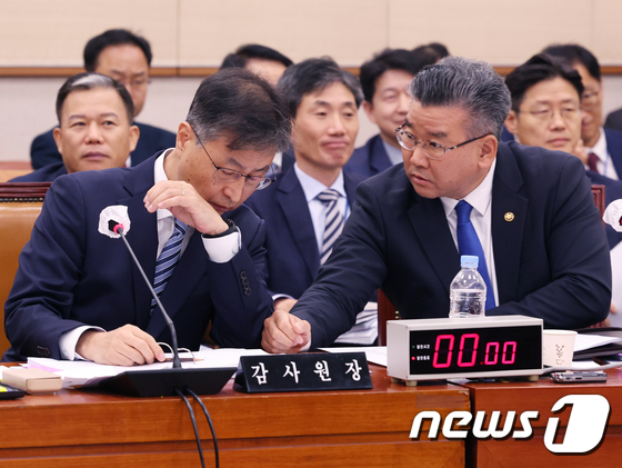 최재해 감사원장과 유병호 사무총장이 지난 2023년 10월 13일 서울 여의도 국회에서 열린 법제사법위원회 국정감사에서 대화를 하고 있다. 2023.10.13/뉴스1 © News1 송원영 기자