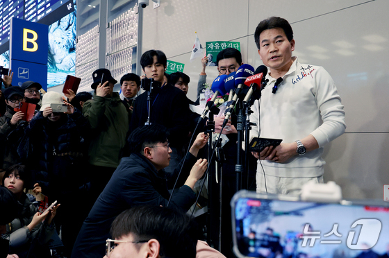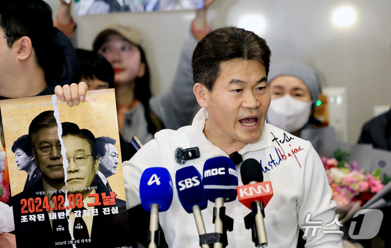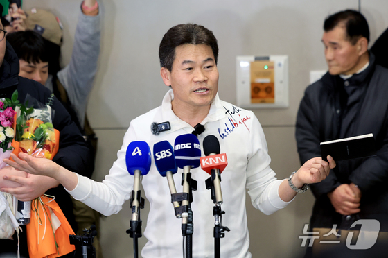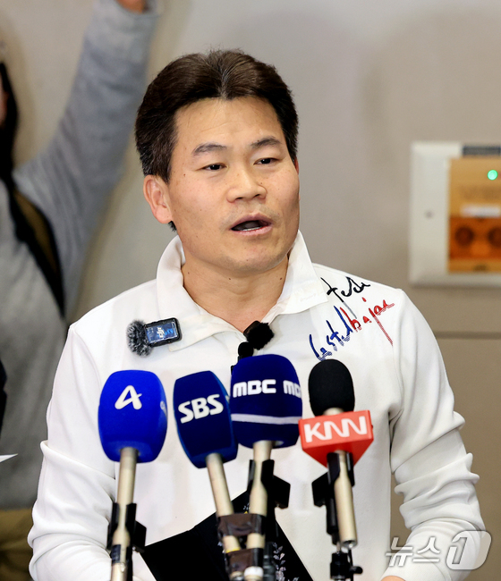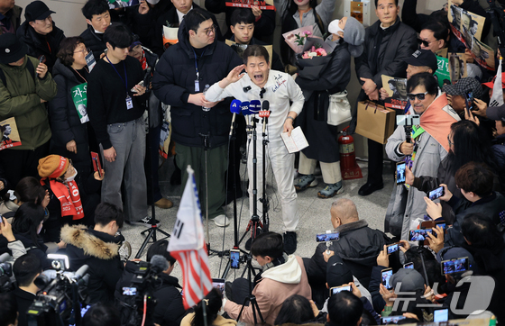 전한길 전 한국사 강사가 3일 인천국제공항 제2여객터미널로 귀국해 기자회견을 갖고 있다. 2026.2.3/뉴스1 © News1 이호윤 기자