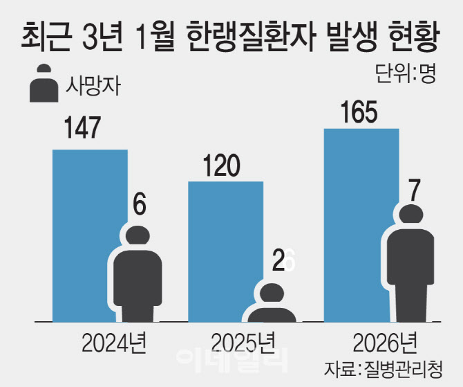 4일 질병관리청의 ‘한랭질환 응급실감시체계’에 따르면 2026년 1월 한 달간 발생한 한랭질환자는 165명으로 전년 동기(120명)보다 45명 증가했다. 이는 2024년 1월(147명)과 비교해도 높은 수치다. 같은 기간 사망자는 7명으로 집계돼 최근 3년 새 가장 많았다.