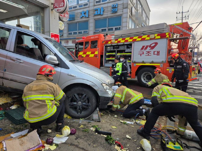 이 사고로 약국 앞에서 채소를 팔던 70대 A씨가 차 바퀴에 깔려 심정지 상태로 병원으로 옮겨졌으나 끝내 숨졌다. A씨와 함께 일하던 자매인 70대 여성도 크게 다쳐 병원으로 이송됐다.