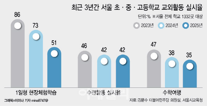 수학여행(소규모 테마형 교육여행)도 비슷한 추이를 보였다. 서울 초·중·고 중 수학여행을 떠난 곳은 2023년 609곳(46%)이었지만 2024년 550곳(41%)으로 감소했다. 지난해에는 556곳(42%)으로 전년도 수준을 유지했다.