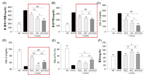 또한, 혈액 내의 지질과 산화물 농도를 비교했을 때, 아토바스타틴 단독군보다 폴리코사놀과의 병용 투여군에서 총콜레스테롤과 중성지방, LDL콜레스테롤이 더 크게 감소해 시너지의 효과를 나타냈다. 특히, 아토바스타틴을 단독으로 투여했을 때 좋은 콜레스테롤이라고 불리는 HDL수치가 감소한 것과는 달리, 폴리코사놀 병용 투여군의 HDL콜레스테롤 수치는 증가했다. HDL은 심혈관질환의 예방인자로 꼽힌다.
