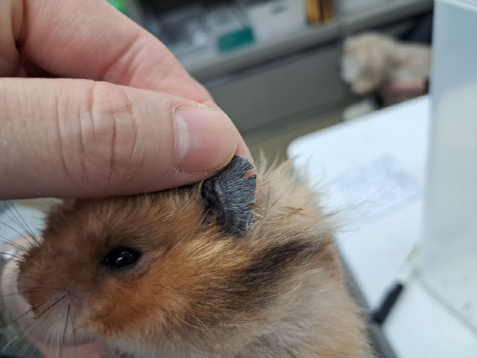 골든햄스터의 귀가 몇 차례 물어뜯겨 패인 모습. (사진=동물자유연대 제공)