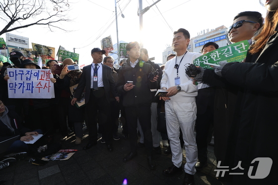 이재명 대통령과 김현지 청와대제1부속실장에 대한 허위 사실을 유포한 혐의로 고발된 한국사 강사 출신 보수 유튜버 전한길 씨가 12일 오전 서울시 동작구 노량진역 앞에서 피의자 신분 경찰 첫 소환 조사 출석에 앞서 입장을 밝히고 있다. 2026.2.12 © 뉴스1 박정호 기자