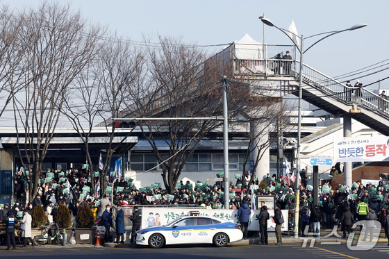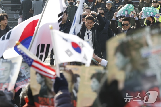 이재명 대통령과 김현지 청와대제1부속실장에 대한 허위 사실을 유포한 혐의로 고발된 한국사 강사 출신 보수 유튜버 전한길 씨 지지자들이 12일 오전 서울시 동작구 노량진역 앞에서 전 씨의 피의자 신분 경찰 첫 소환 조사 출석에 앞서 열린 기자회견에서 손피켓을 들어 환호하고 있다. 2026.2.12 © 뉴스1 박정호 기자