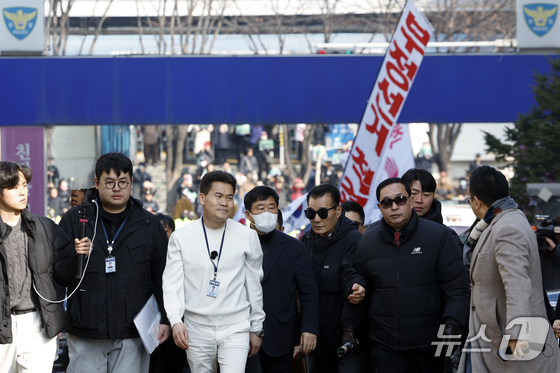 이재명 대통령과 김현지 청와대제1부속실장에 대한 허위 사실을 유포한 혐의로 고발된 한국사 강사 출신 보수 유튜버 전한길 씨가 12일 오전 서울시 동작구 노량진로 동작경찰서로 피의자 신분 첫 소환 조사에 출석하고 있다. 2026.2.12 © 뉴스1 박정호 기자