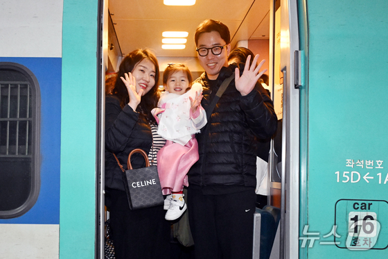 설 명절 연휴를 앞둔 13일 오전 서울역에서 귀성길에 오른 가족이 열차에 올라 손을 흔들고 있다. 2026.2.13 © 뉴스1 구윤성 기자