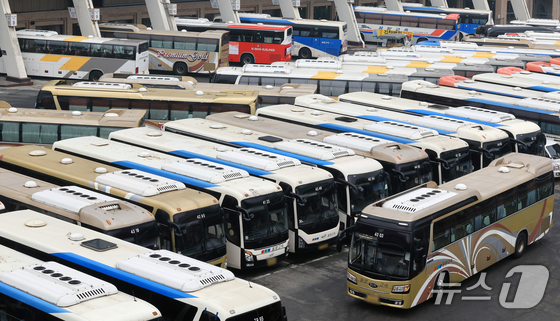 설 연휴를 하루 앞둔 13일 오후 서울 서초구 고속버스터미널에서 귀성버스들이 출발시간을 기다리고 있다. 2026.2.13 © 뉴스1 이호윤 기자