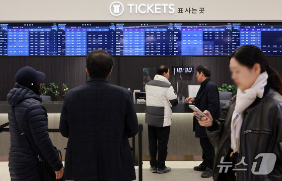 설 연휴를 하루 앞둔 13일 오후 서울 서초구 고속버스터미널에서 귀성객들이 버스승차권을 발권받고 있다. 2026.2.13 © 뉴스1 이호윤 기자