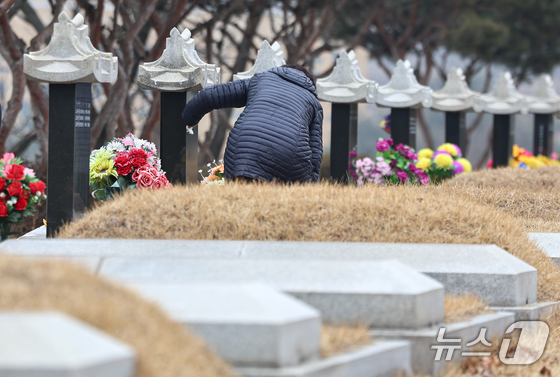 설날을 닷새 앞둔 12일 인천 부평구 인천가족공원을 찾은 한 성묘객이 성묘하고 있다. 2026.2.13 © 뉴스1 김도우 기자