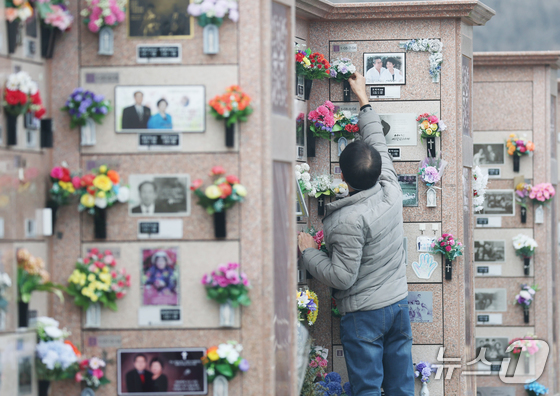 설 연휴를 하루 앞둔 13일 경기 용인시 처인구 천주교용인공원묘원에서 성묘객들이 가족의 묘를 찾아 성묘를 하고 있다. 2026.2.13 © 뉴스1 김영운 기자