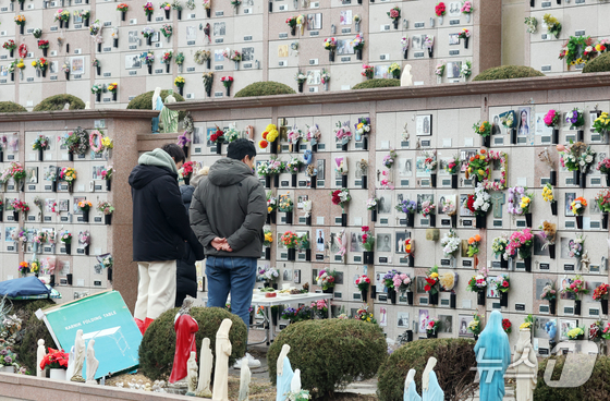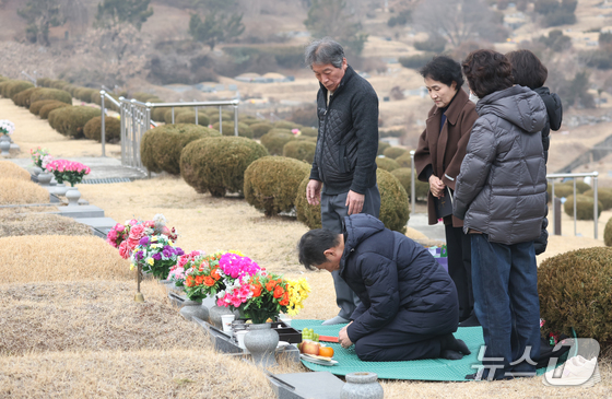 설날을 닷새 앞둔 12일 인천 부평구 인천가족공원을 찾은 한 가족이 성묘하고 있다. 2026.2.13 © 뉴스1 김도우 기자