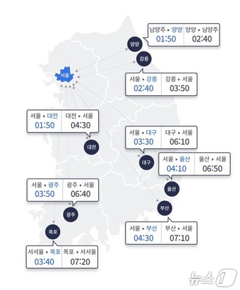 이날 오후 6시 요금소 출발 기준 서울에서 지방까지 예상 소요 시간은 △부산 4시간 30분 △울산 4시간 10분 △강릉 2시간 40분 △양양 1시간 50분(남양주 출발) △대전 1시간 50분 △광주 3시간 50분 △목포 3시간 40분(서서울 출발) △대구 3시간 30분이다.