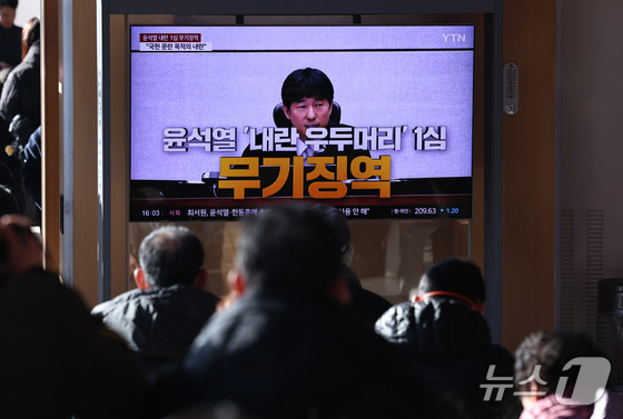 19일 오후 서울역 대합실에 설치된 TV를 통해 윤석열 전 대통령의 내란 우두머리 혐의 1심 선고가 생중계 되고 있다. 윤 전 대통령은 2024년 12월 3일 비상계엄을 선포한 지 443일 만에 무기징역을 선고받았다. 2026.2.19 © 뉴스1 구윤성 기자