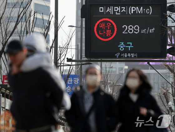 서울시에 올해 첫 미세먼지 경보가 발령된 22일 오후 서울 중구 시청역 앞에 설치된 전광판에 대기질 농도가 표시되고 있다. 2026.2.22 © 뉴스1 황기선 기자