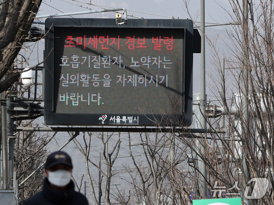 서울시에 올해 첫 미세먼지 경보가 발령된 22일 오후 서울 중구 시청역 앞에 설치된 전광판에 '초미세먼지 경보 발령' 안내문이 나타나고 있다. 2026.2.22 © 뉴스1 황기선 기자