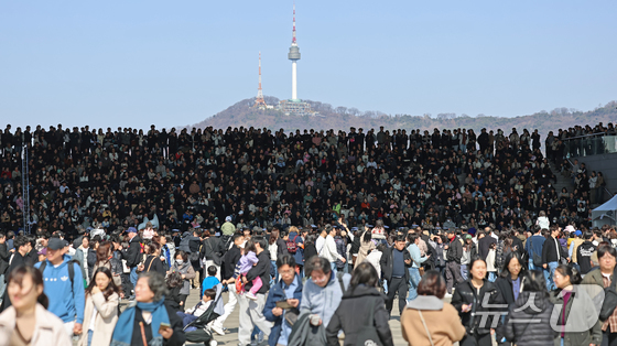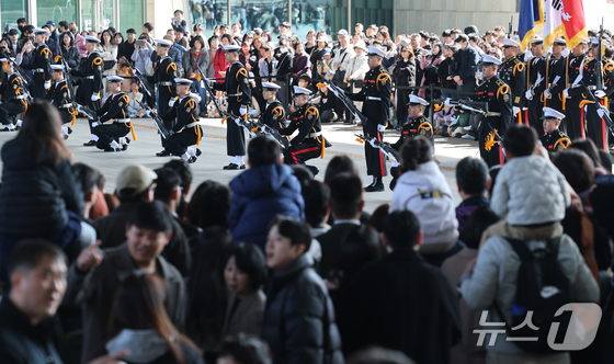 28일 오후 서울 용산구 국립중앙박물관을 찾은 시민들이 ‘충무공 이순신의 후예’ 대한민국 해군 의장대·군악대의 특별 공연을 관람하고있다. 2026.2.28 © 뉴스1 오대일 기자