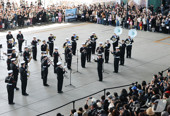 28일 오후 서울 용산구 국립중앙박물관 열린마당에서 ‘충무공 이순신의 후예’대한민국 해군 군악대의 특별 공연이 열리고 있다. 2026.2.28 © 뉴스1 오대일 기자