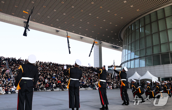 28일 오후 서울 용산구 국립중앙박물관 열린마당에서 ‘충무공 이순신의 후예’대한민국 해군 의장대의 특별 공연이 열리고 있다. 2026.2.28 © 뉴스1 오대일 기자