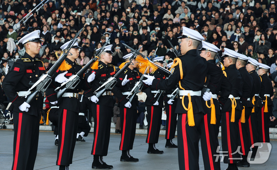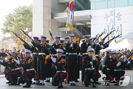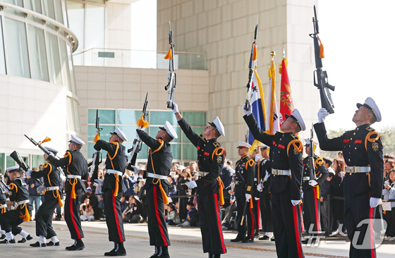 28일 오후 서울 용산구 국립중앙박물관 열린마당에서 ‘충무공 이순신의 후예’ 대한민국 해군 의장대의 특별 공연이 열리고 있다. 2026.2.28 © 뉴스1 오대일 기자