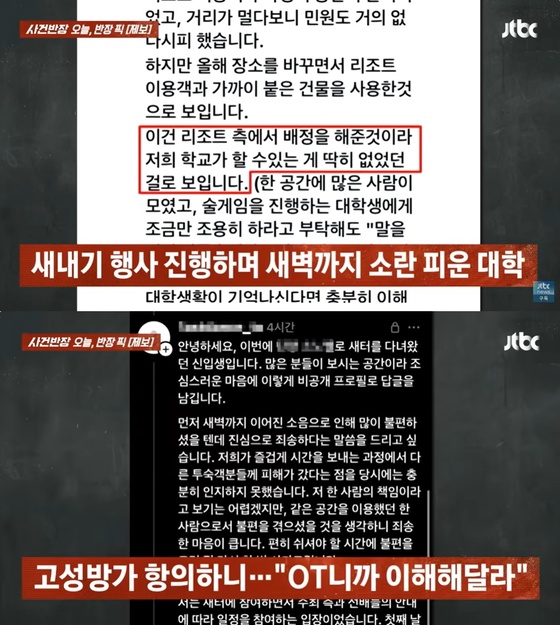 호텔 측은 "서울 소재의 S대학교 OT 행사인데 이미 몇 번 주의를 주고 왔다"라고 밝혔다. 그런데도 고성과 소음은 지속됐고, 다음 날 새벽 4시가 넘은 시간까지 이어졌다.